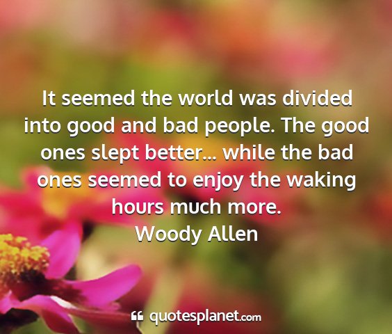 It seemed the world was divided into good and bad people. The good ones slept better... while the bad ones seemed to enjoy the waking hours much more.Woody Allen