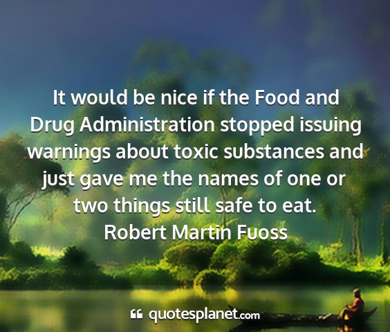 It would be nice if the Food and Drug Administration stopped issuing warnings about toxic substances and just gave me the names of one or two things still safe to eat.Robert Martin Fuoss