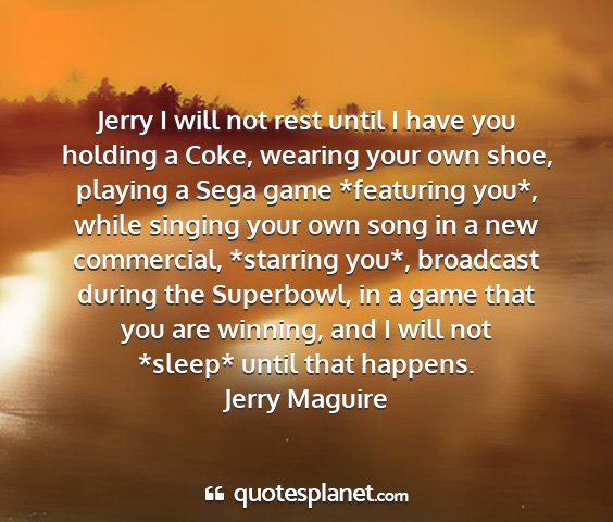 Jerry I will not rest until I have you holding a Coke, wearing your own shoe, playing a Sega game *featuring you*, while singing your own song in a new commercial, *starring you*, broadcast during the Superbowl, in a game that you are winning, and I will not *sleep* until that happens.Jerry Maguire