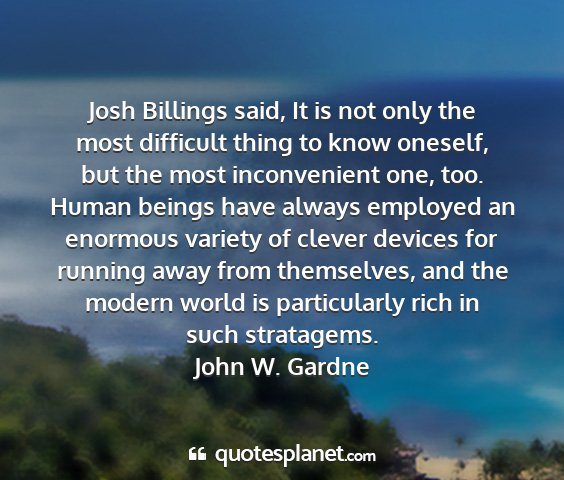 Josh Billings said, It is not only the most difficult thing to know oneself, but the most inconvenient one, too. Human beings have always employed an enormous variety of clever devices for running away from themselves, and the modern world is particularly rich in such stratagems.John W. Gardne