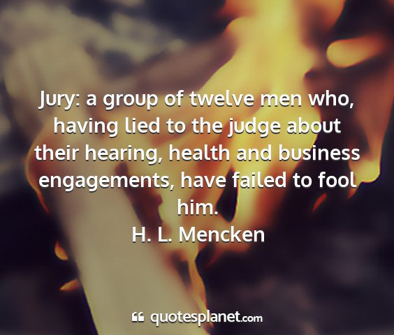 Jury: a group of twelve men who, having lied to the judge about their hearing, health and business engagements, have failed to fool him.H. L. Mencken