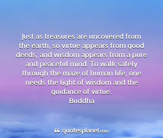 Just as treasures are uncovered from the earth, so virtue appears from good deeds, and wisdom appears from a pure and peaceful mind. To walk safely through the maze of human life, one needs the light of wisdom and the guidance of virtue.Buddha