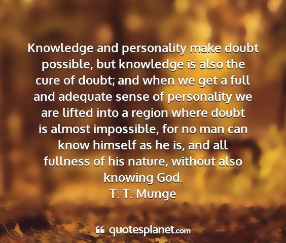 Knowledge and personality make doubt possible, but knowledge is also the cure of doubt; and when we get a full and adequate sense of personality we are lifted into a region where doubt is almost impossible, for no man can know himself as he is, and all fullness of his nature, without also knowing God.T. T. Munge