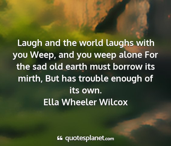 Laugh and the world laughs with you Weep, and you weep alone For the sad old earth must borrow its mirth, But has trouble enough of its own.Ella Wheeler Wilcox