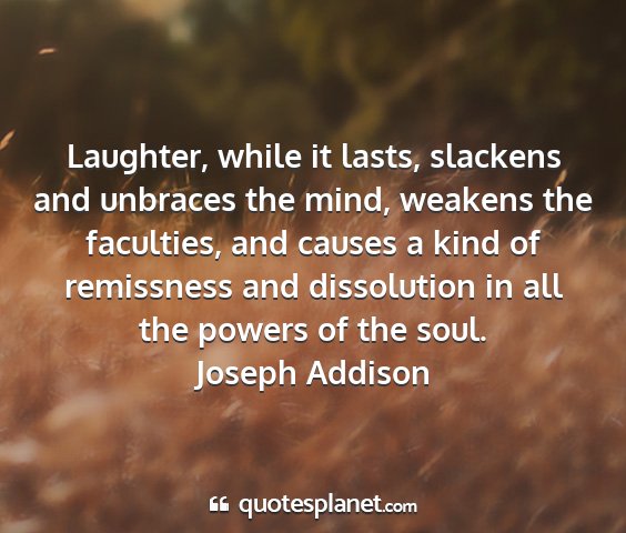 Laughter, while it lasts, slackens and unbraces the mind, weakens the faculties, and causes a kind of remissness and dissolution in all the powers of the soul.Joseph Addison