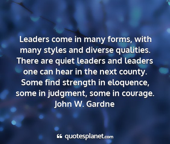 Leaders come in many forms, with many styles and diverse qualities. There are quiet leaders and leaders one can hear in the next county. Some find strength in eloquence, some in judgment, some in courage.John W. Gardne