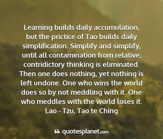 Learning builds daily accumulation, but the prictice of Tao builds daily simplification. Simplify and simplify, until all contamination from relative, contridictory thinking is eliminated. Then one does nothing, yet nothing is left undone. One who wins the world does so by not meddling with it. One who meddles with the world loses it.Lao - Tzu, Tao te Ching