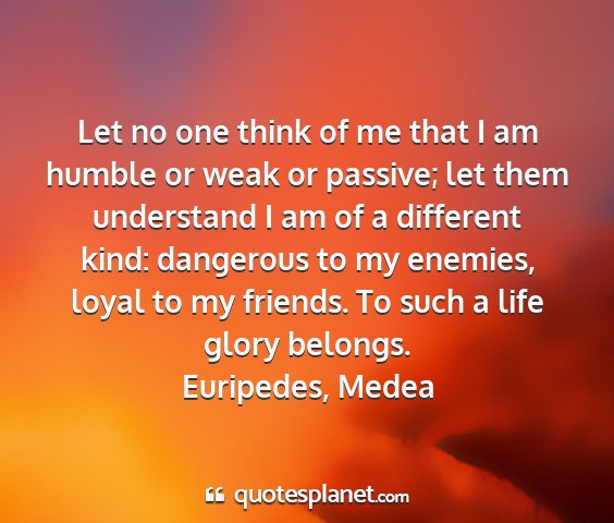 Let no one think of me that I am humble or weak or passive; let them understand I am of a different kind: dangerous to my enemies, loyal to my friends. To such a life glory belongs.Euripedes, Medea