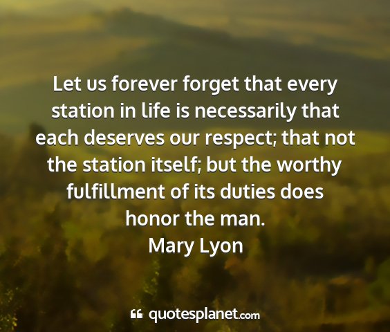 Let us forever forget that every station in life is necessarily that each deserves our respect; that not the station itself; but the worthy fulfillment of its duties does honor the man.Mary Lyon