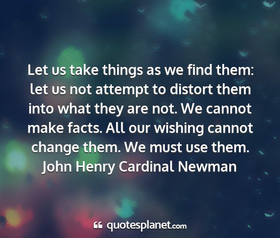 Let us take things as we find them: let us not attempt to distort them into what they are not. We cannot make facts. All our wishing cannot change them. We must use them.John Henry Cardinal Newman