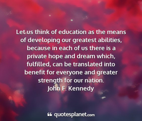 Let us think of education as the means of developing our greatest abilities, because in each of us there is a private hope and dream which, fulfilled, can be translated into benefit for everyone and greater strength for our nation.John F. Kennedy