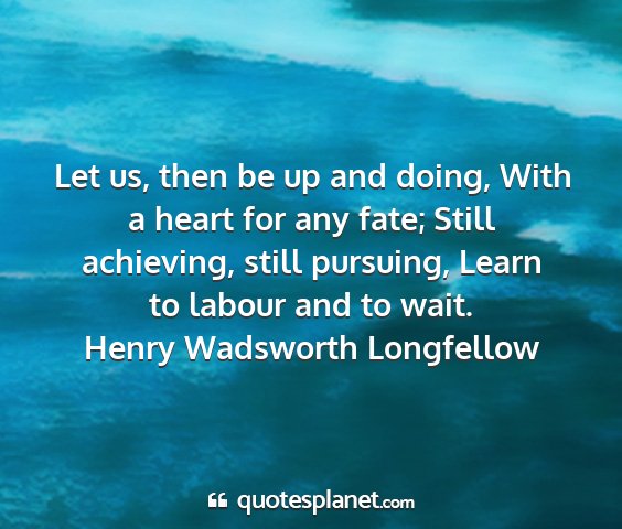 Let us, then be up and doing, With a heart for any fate; Still achieving, still pursuing, Learn to labour and to wait.Henry Wadsworth Longfellow