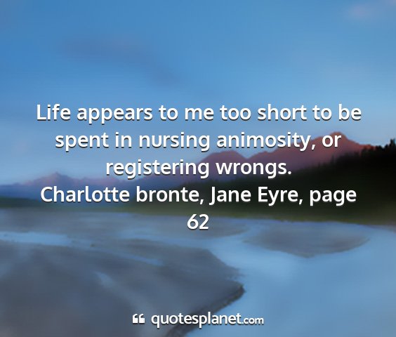 Life appears to me too short to be spent in nursing animosity, or registering wrongs.Charlotte bronte, Jane Eyre, page 62