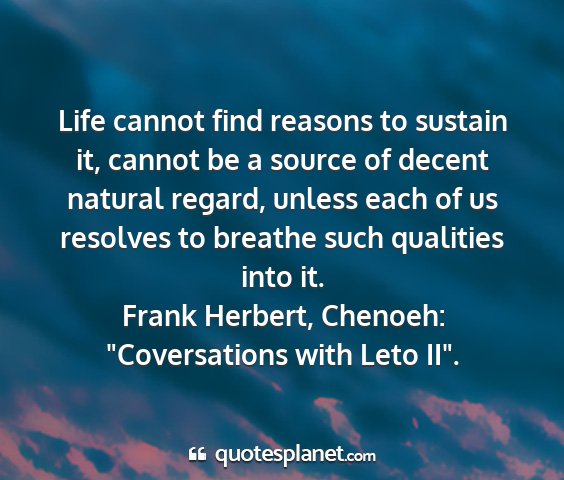 Life cannot find reasons to sustain it, cannot be a source of decent natural regard, unless each of us resolves to breathe such qualities into it.Frank Herbert, Chenoeh: "Coversations with Leto II".