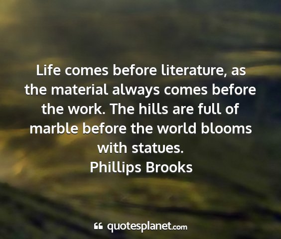 Life comes before literature, as the material always comes before the work. The hills are full of marble before the world blooms with statues.Phillips Brooks