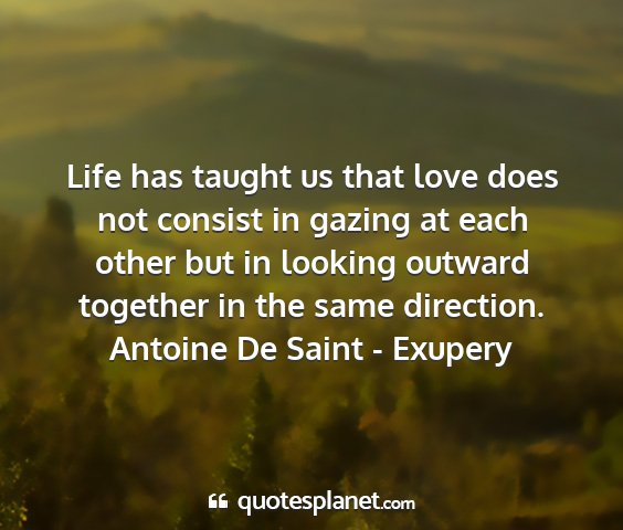 Life has taught us that love does not consist in gazing at each other but in looking outward together in the same direction.Antoine De Saint - Exupery