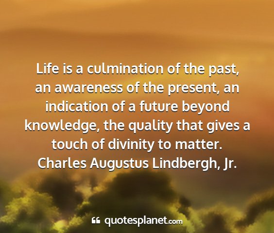 Life is a culmination of the past, an awareness of the present, an indication of a future beyond knowledge, the quality that gives a touch of divinity to matter.Charles Augustus Lindbergh, Jr.
