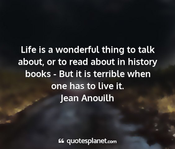 Life is a wonderful thing to talk about, or to read about in history books - But it is terrible when one has to live it.Jean Anouilh