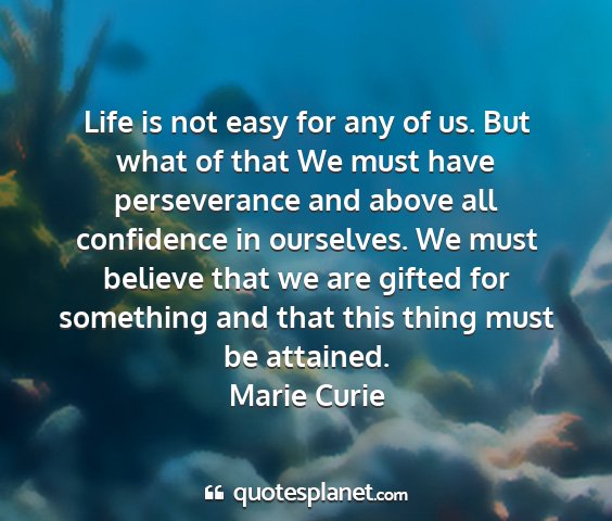 Life is not easy for any of us. But what of that We must have perseverance and above all confidence in ourselves. We must believe that we are gifted for something and that this thing must be attained.Marie Curie