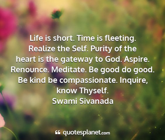 Life is short. Time is fleeting. Realize the Self. Purity of the heart is the gateway to God. Aspire. Renounce. Meditate. Be good do good. Be kind be compassionate. Inquire, know Thyself.Swami Sivanada