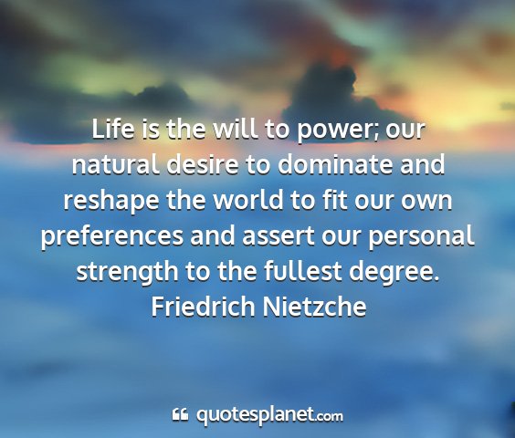 Life is the will to power; our natural desire to dominate and reshape the world to fit our own preferences and assert our personal strength to the fullest degree.Friedrich Nietzche