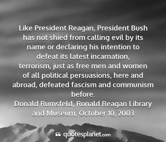 Like President Reagan, President Bush has not shied from calling evil by its name or declaring his intention to defeat its latest incarnation, terrorism, just as free men and women of all political persuasions, here and abroad, defeated fascism and communism before.Donald Rumsfeld, Ronald Reagan Library and Museum, October 10, 2003
