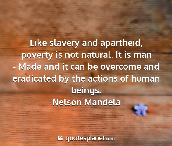 Like slavery and apartheid, poverty is not natural. It is man - Made and it can be overcome and eradicated by the actions of human beings.Nelson Mandela