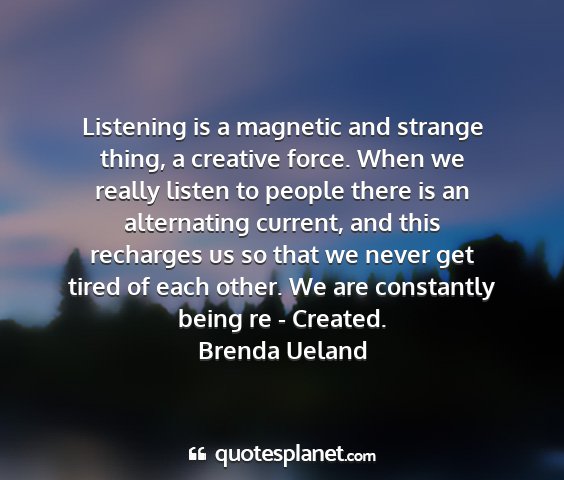 Listening is a magnetic and strange thing, a creative force. When we really listen to people there is an alternating current, and this recharges us so that we never get tired of each other. We are constantly being re - Created.Brenda Ueland