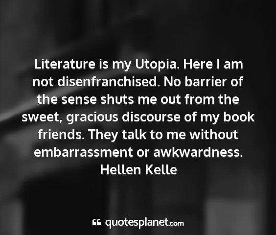 Literature is my Utopia. Here I am not disenfranchised. No barrier of the sense shuts me out from the sweet, gracious discourse of my book friends. They talk to me without embarrassment or awkwardness.Hellen Kelle