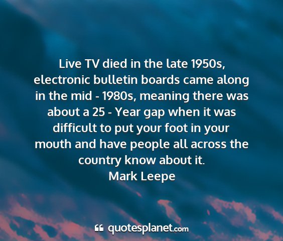 Live TV died in the late 1950s, electronic bulletin boards came along in the mid - 1980s, meaning there was about a 25 - Year gap when it was difficult to put your foot in your mouth and have people all across the country know about it.Mark Leepe