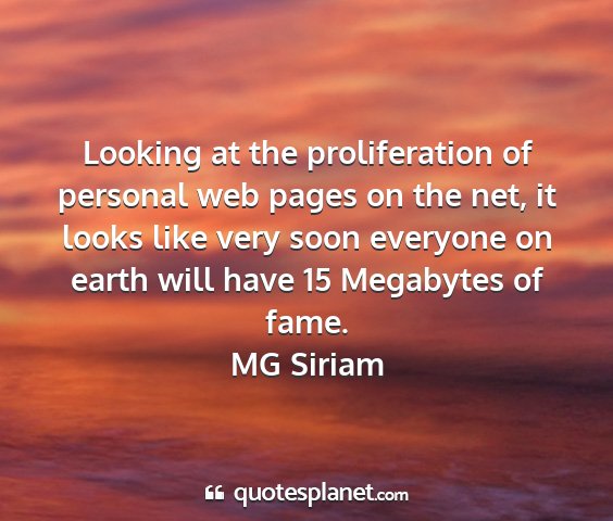 Looking at the proliferation of personal web pages on the net, it looks like very soon everyone on earth will have 15 Megabytes of fame.MG Siriam