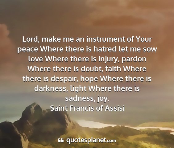 Lord, make me an instrument of Your peace Where there is hatred let me sow love Where there is injury, pardon Where there is doubt, faith Where there is despair, hope Where there is darkness, light Where there is sadness, joy.Saint Francis of Assisi