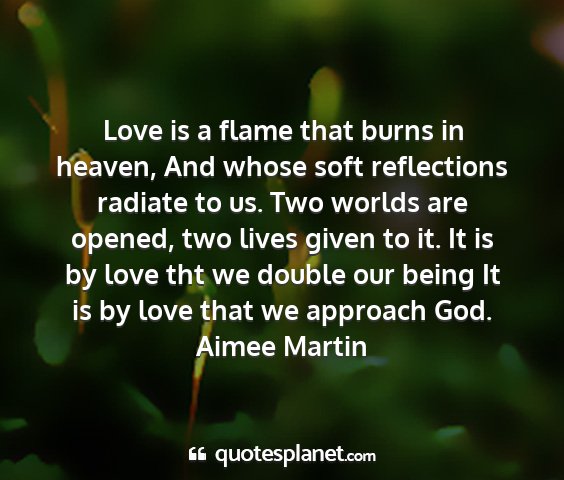 Love is a flame that burns in heaven, And whose soft reflections radiate to us. Two worlds are opened, two lives given to it. It is by love tht we double our being It is by love that we approach God.Aimee Martin