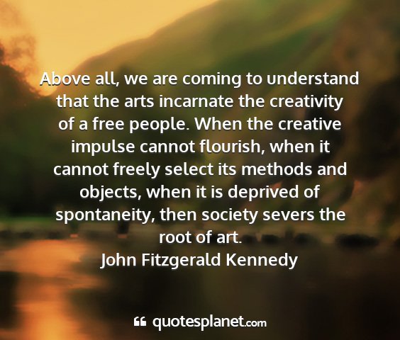 Above all, we are coming to understand that the arts incarnate the creativity of a free people. When the creative impulse cannot flourish, when it cannot freely select its methods and objects, when it is deprived of spontaneity, then society severs the root of art.John Fitzgerald Kennedy