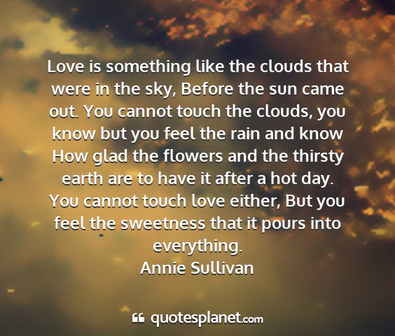 Love is something like the clouds that were in the sky, Before the sun came out. You cannot touch the clouds, you know but you feel the rain and know How glad the flowers and the thirsty earth are to have it after a hot day. You cannot touch love either, But you feel the sweetness that it pours into everything.Annie Sullivan