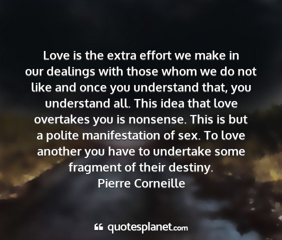 Love is the extra effort we make in our dealings with those whom we do not like and once you understand that, you understand all. This idea that love overtakes you is nonsense. This is but a polite manifestation of sex. To love another you have to undertake some fragment of their destiny.Pierre Corneille