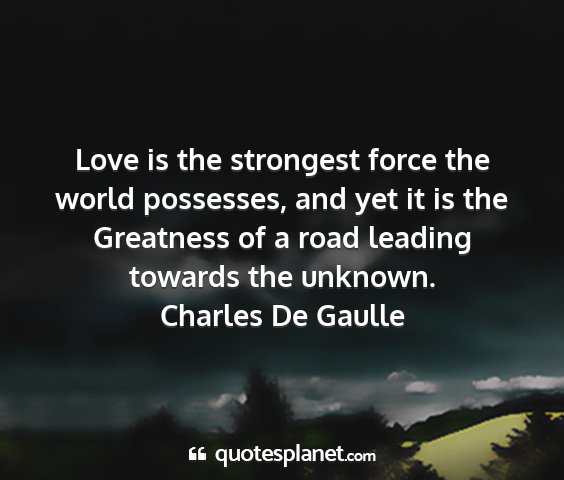 Love is the strongest force the world possesses, and yet it is the Greatness of a road leading towards the unknown.Charles De Gaulle