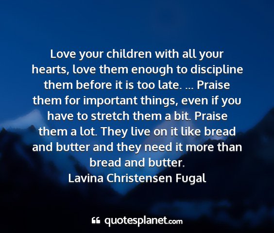 Love your children with all your hearts, love them enough to discipline them before it is too late. ... Praise them for important things, even if you have to stretch them a bit. Praise them a lot. They live on it like bread and butter and they need it more than bread and butter.Lavina Christensen Fugal