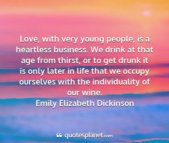 Love, with very young people, is a heartless business. We drink at that age from thirst, or to get drunk it is only later in life that we occupy ourselves with the individuality of our wine.Emily Elizabeth Dickinson