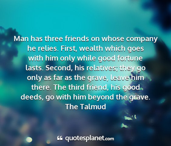 Man has three friends on whose company he relies. First, wealth which goes with him only while good fortune lasts. Second, his relatives; they go only as far as the grave, leave him there. The third friend, his good deeds, go with him beyond the grave.The Talmud