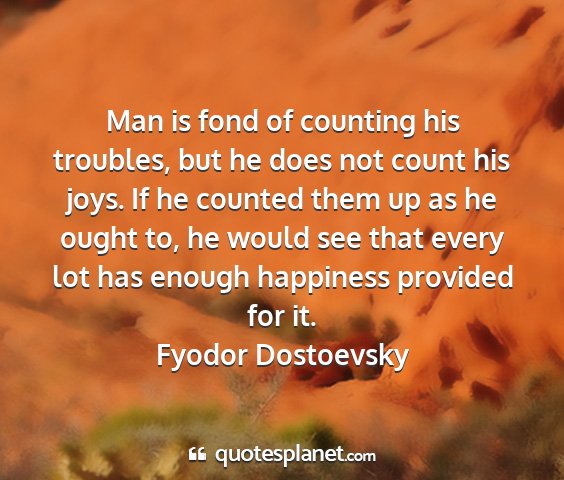Man is fond of counting his troubles, but he does not count his joys. If he counted them up as he ought to, he would see that every lot has enough happiness provided for it.Fyodor Dostoevsky