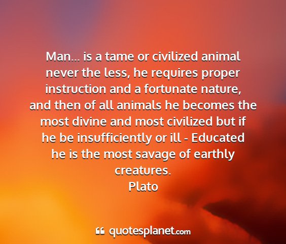 Man... is a tame or civilized animal never the less, he requires proper instruction and a fortunate nature, and then of all animals he becomes the most divine and most civilized but if he be insufficiently or ill - Educated he is the most savage of earthly creatures.Plato