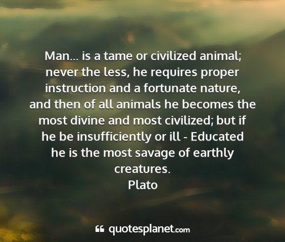 Man... is a tame or civilized animal; never the less, he requires proper instruction and a fortunate nature, and then of all animals he becomes the most divine and most civilized; but if he be insufficiently or ill - Educated he is the most savage of earthly creatures.Plato