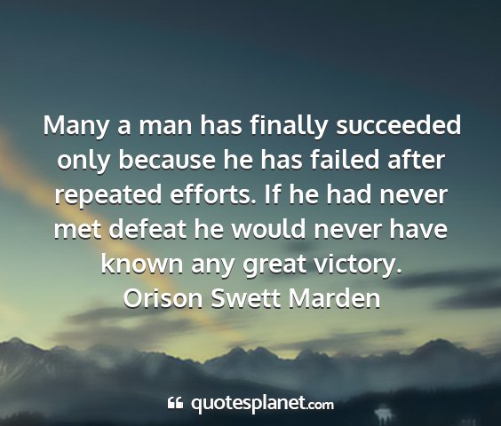 Many a man has finally succeeded only because he has failed after repeated efforts. If he had never met defeat he would never have known any great victory.Orison Swett Marden