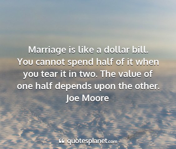 Marriage is like a dollar bill. You cannot spend half of it when you tear it in two. The value of one half depends upon the other.Joe Moore