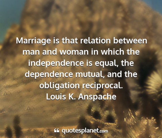 Marriage is that relation between man and woman in which the independence is equal, the dependence mutual, and the obligation reciprocal.Louis K. Anspache