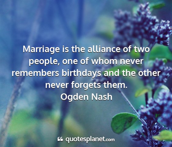 Marriage is the alliance of two people, one of whom never remembers birthdays and the other never forgets them.Ogden Nash
