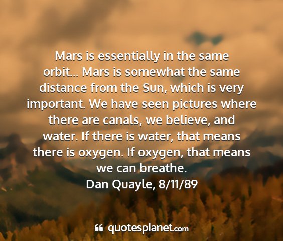 Mars is essentially in the same orbit... Mars is somewhat the same distance from the Sun, which is very important. We have seen pictures where there are canals, we believe, and water. If there is water, that means there is oxygen. If oxygen, that means we can breathe.Dan Quayle, 8/11/89