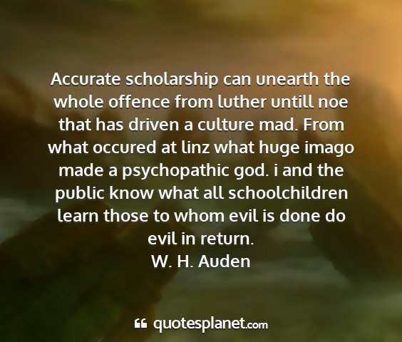 Accurate scholarship can unearth the whole offence from luther untill noe that has driven a culture mad. From what occured at linz what huge imago made a psychopathic god. i and the public know what all schoolchildren learn those to whom evil is done do evil in return.W. H. Auden