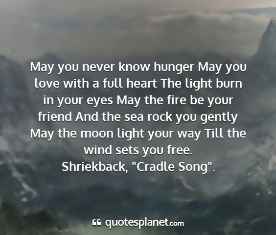 May you never know hunger May you love with a full heart The light burn in your eyes May the fire be your friend And the sea rock you gently May the moon light your way Till the wind sets you free.